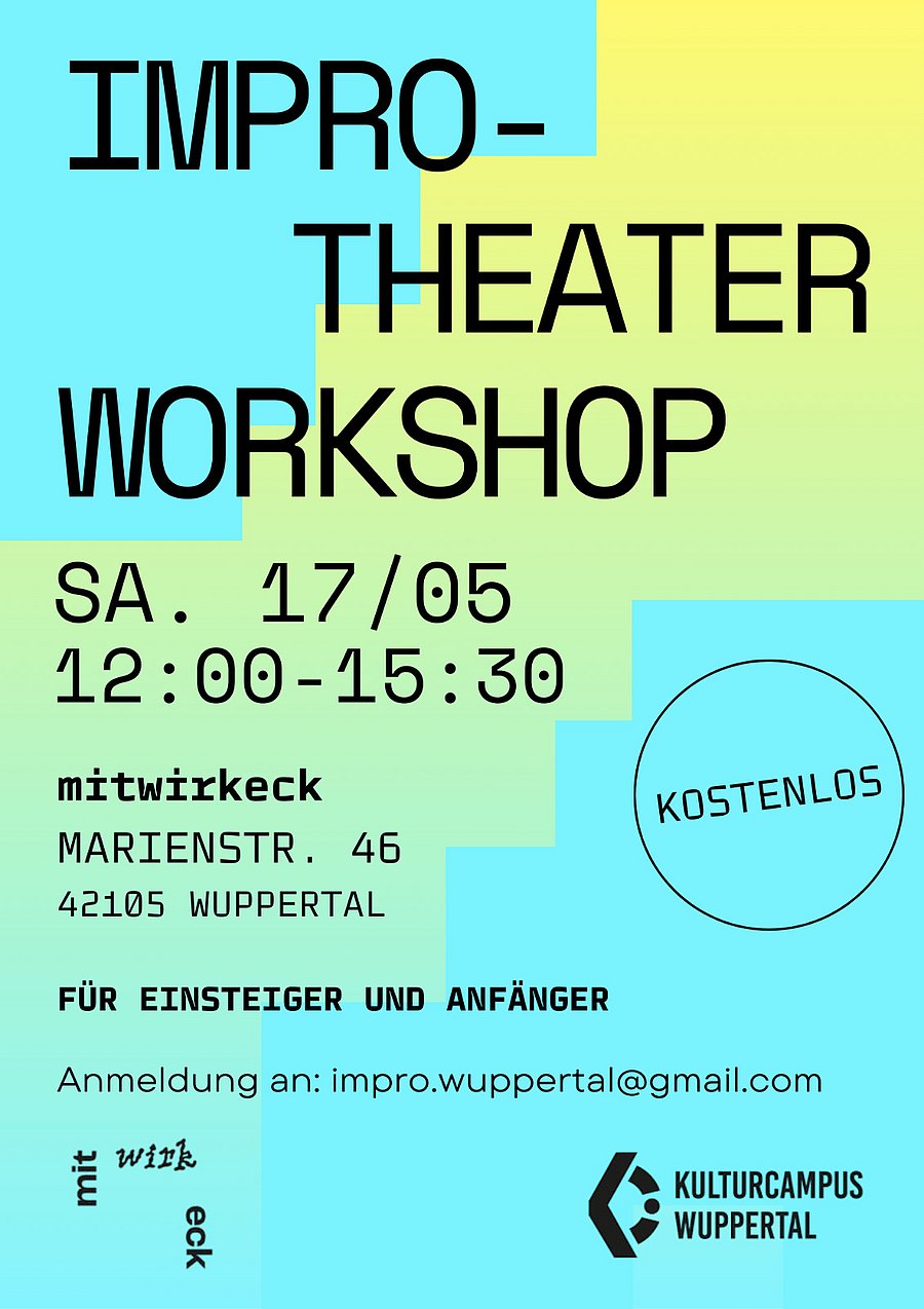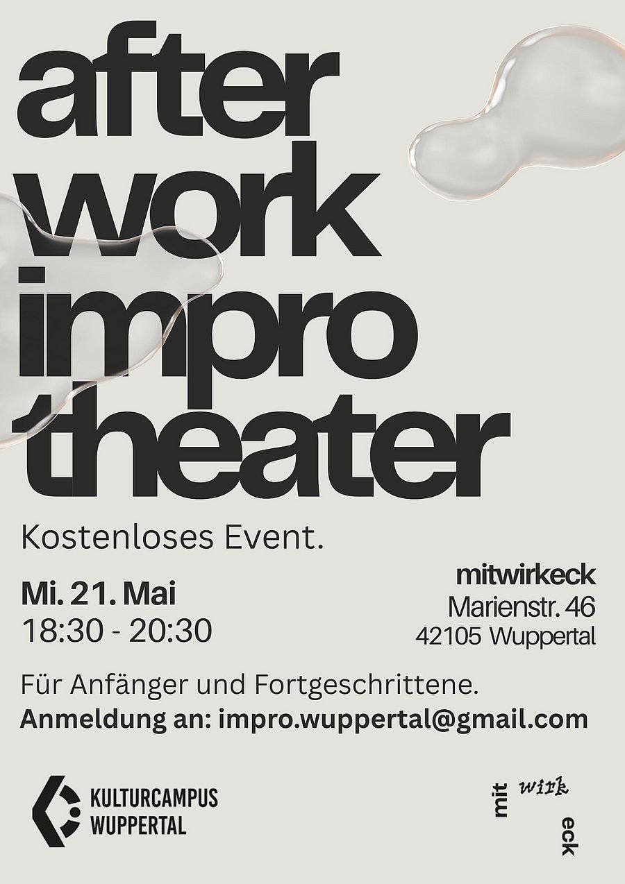 Im Rahmen des Projekts „Improtheater für Alle“ fanden im Mai 2025 zwei kostenlose Veranstaltungen im Mitwirkeck, Marienstraße 46 in Wuppertal, statt. Am Samstag, den 17. Mai 2025, wurde ein Improtheater-Workshop für Einsteiger angeboten. Der zweite Termin, „After Work Improtheater“ am Mittwoch, den 21. Mai 2025, richtete sich an Anfänger*innen und Fortgeschrittene. Bei beiden Terminen stand das unmittelbare Ausprobieren und kreative Zusammenspiel im Mittelpunkt. Ohne lange zu überlegen, wurden Szenen entwickelt, Figuren erfunden und gemeinsam neue Geschichten erschaffen. Ob beim Aufstellen neuer Bauernregeln, in der WG des Teufels oder im glücklichsten Bus der Welt – die Teilnehmenden brachten mit Spontanität, Mut und Humor den Raum zum Leben. Ziel des Projekts war es, den Austausch, die Bewegung und das gemeinsame kreative Spiel zu fördern.